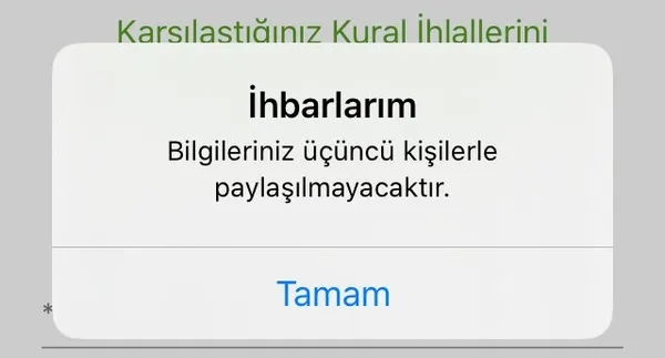 ''İhbar edersem adım ve soyadım görünür mü?'' diye düşünebilirsiniz. Fakat bu konuda uygulamanın güzel bir yanı var. Zira, ihbar kayıtlarında kişisel bilgileriniz 3. kişilerle paylaşılmayacak. Yani şikayette bulunduğunuz kişi veya kurum sizin kişisel bilgilerinizi öğrenemeyecek.
