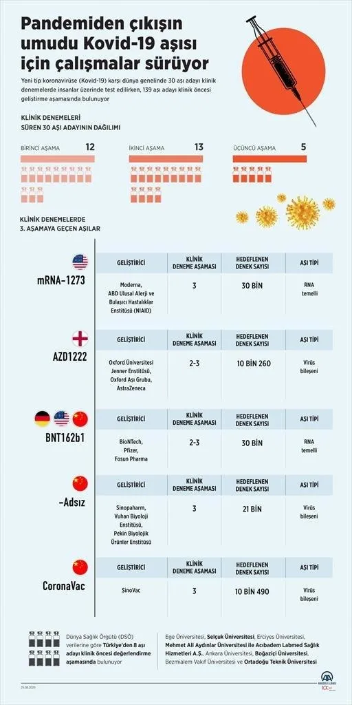 Bunlar arasında Türkiye'den Ege Üniversitesi, Selçuk Üniversitesi, Erciyes Üniversitesi, Mehmet Ali Aydınlar Üniversitesi ile Acıbadem Labmed Sağlık Hizmetleri AŞ, Ankara Üniversitesi, Boğaziçi Üniversitesi, Bezmialem Vakıf Üniversitesi ve Ortadoğu Teknik Üniversitesinin aşı çalışmaları yer alıyor.