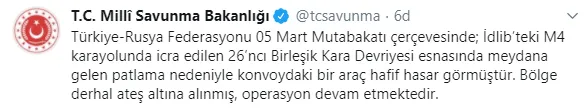 MSB'den yapılan son dakika açıklamasında "Türkiye-Rusya Federasyonu 05 Mart Mutabakatı çerçevesinde; İdlib’teki M4 karayolunda icra edilen 26’ncı Birleşik Kara Devriyesi esnasında meydana gelen patlama nedeniyle konvoydaki bir araç hafif hasar gördü. Bölge derhal ateş altına alınmış, operasyon devam etmektedir" denildi.