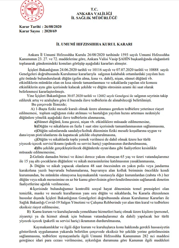 Ankara İl Umumi Hıfzıssıhha Kurulu 26/08/2020 tarihinde 1593 sayılı Umumi Hıfzıssıhha Kanununun 23. 27. ve 72. maddelerine göre, Ankara Valisi Vasip ŞAHİN başkanlığında olağanüstü toplanarak gündemindeki konuları görüşüp aşağıdaki kararları almıştır.