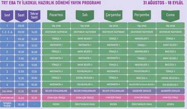 31 Ağustos uzaktan eğitim ders saatleri açıklandı. EBA TV ilkokul kanalında saat 09:00 ve 10:00'da 1. sınıflar için eğitim verilecek. Geçtiğimiz yıl saat 09:00'da 1. sınıf dersleri başlamış, 10:00'da 11:00'a kadar ise 2. sınıflar için eğitim verilmişti. Liseler için ise 09:00'da 9. sınıf dersleri anlatılmıştı. EBA TV ortaokul ders programı ise ilk olarak 5. sınıf dersleri ile başlıyor.