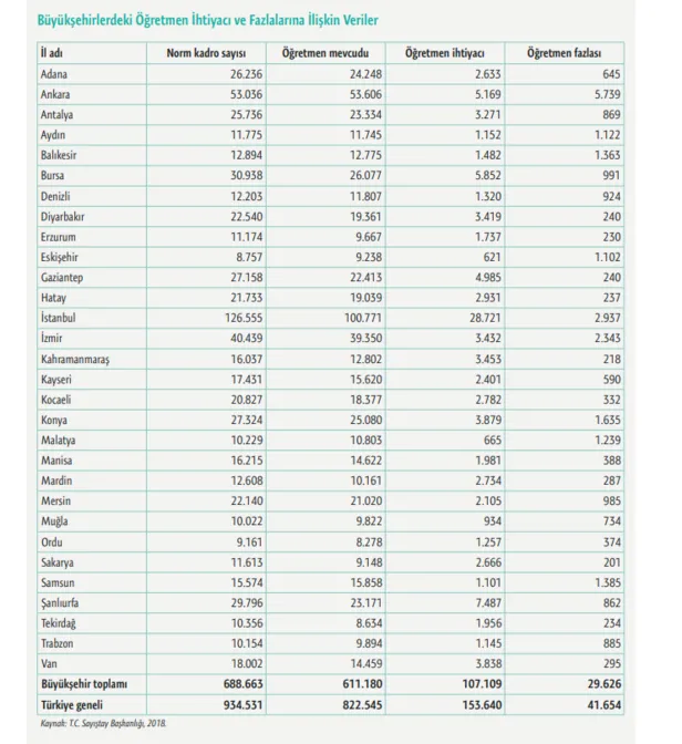 Raporda en çok öğretmene ihtiyacı olan şehir İstanbul olurken en fazla öğretmeni bulunan şehir Ankara oluyor.