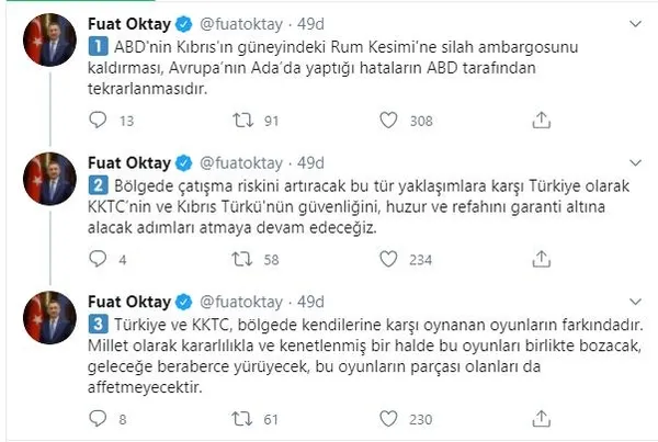 Cumhurbaşkanı Yardımcısı Fuat Oktay, ABD'nin Güney Kıbrıs Kesimi'ne silah ambargosunu kaldırmasına yönelik "Bölgede çatışma riskini artıracak bu tür yaklaşımlara karşı Türkiye olarak KKTC'nin ve Kıbrıs Türkü'nün güvenliğini, huzur ve refahını garanti altına alacak adımları atmaya devam edeceğiz." ifadesini kullandı.