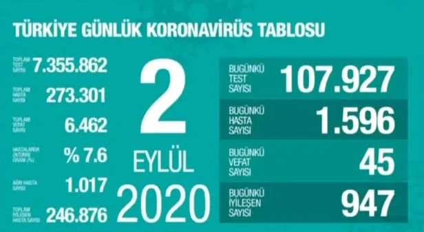 2 Eylül korona tablosu! Koronavirüs vaka sayısı bugün kaç oldu? İşte iyileşen ve ölüm son durum tablosu