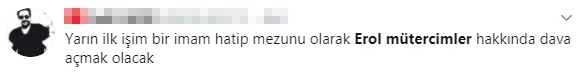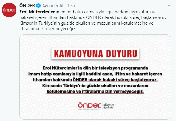 Çal, "ÖNDER İmam Hatipliler Derneği olarak hemen hızlı şekilde avukatlarımıza talimatı verdik. Bu konuyla ilgili hukuki süreci hızlı şekilde başlattık. 81 ilde Erol Mütercimler hakkında suç duyurusunda bulunacağız. Aynı şekilde tüm illerimizdeki imam hatipliler derneklerini aynı davayı açması için teşvik ediyoruz. Arkadaşlarımız da şu anda teyakkuz halindeler, onlar da çok inanılmaz tepki koymuş durumdalar. Erol Mütercimler denen bu adama dava açacaklar." dedi.