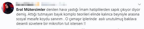 "Erol Mütercimler'den derhal özür dilemesini istiyoruz. Çünkü imam hatipliler Türkiye'ye değer yetiştiren, Türkiye'nin gelişimine katkı sağlayan çok değerli isimleri üreten okullarımız. Bu imam hatipler devletin okulları. Devletin müfredatını belirlediği okullar, devletin disipline ettiği, teftiş ettiği okullar. Bunlar çok önemli. Sanki imam hatipler bu ülkede yer altında örgütlenmiş yapılar gibi bir yaklaşım tarzı ortaya konulması çok çirkin.