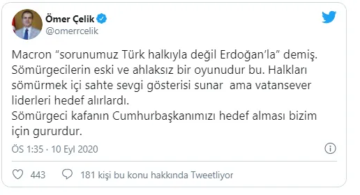 Bizim sizin gibi sömürgeci kafalarla sorunumuz var Bay Macron. Acı çektirdiğiniz haklarla ve sömürmek istediğiniz halklarla insani ve kardeşlik bağımız var. O yüzden sizinle karşı karşıyayız. Tehdit dili kullandığınız ülke Türkiye'dir. Türkiye size en uygun cevapları verecektir.