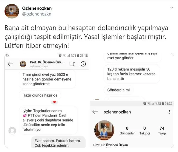 Akdeniz Üniversitesi Rektörü Prof. Dr. Özlenen Özkan'ın twitter'daki hesabı kopyalandı. Öğrencilere mesaj gönderip telefon hattı üzerinden para toplandı. Olayı fark eden Prof. Dr. Özlenen Özkan, kendi orijinal hesabından uyarıda bulundu. "Bana ait olmayan bu hesaptan dolandırıcılık yapılmaya çalışıldığı tespit edilmiştir. Lütfen itibar etmeyin!" açıklaması yaptı.