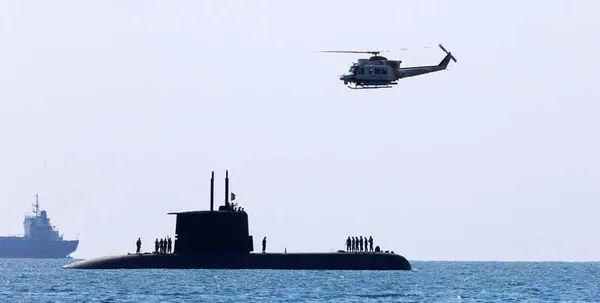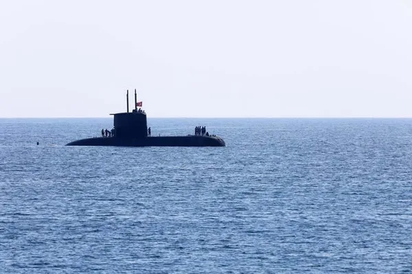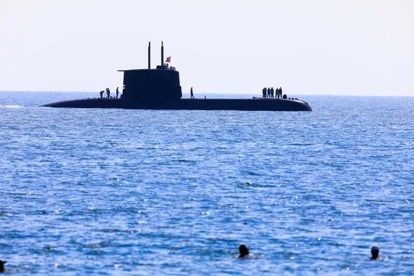 Türk Deniz Kuvvetleri'ne ait denizaltı, üst kısmı denizin üstünde hızla seyrederken bir grup Türk askerinin de denizaltı üstünde olduğu görüldü.