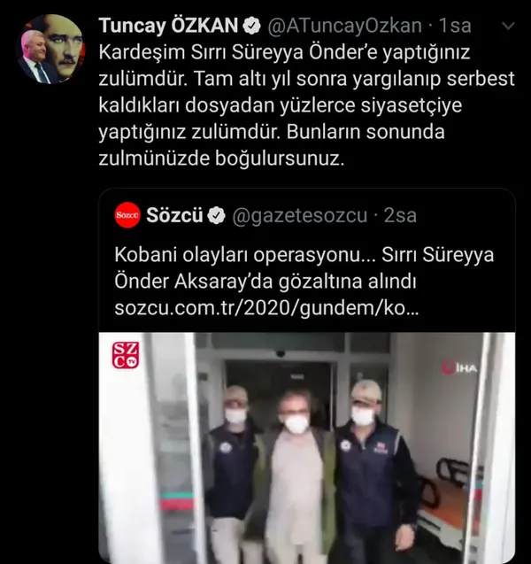 Özkan, Twitter'dan yaptığı açıklamada, "Kars'ın seçilmiş Belediye Başkanı Ayhan Bilgen'den, RTÜK üyesi Ali Ürküt'e, Sırrı Süreyya Önder'e kadar yüzlerce insan, uydurulmuş gerekçelerle zulm altına alınıyorsa, bedeli ağır olur. Zalimler unutmasın adalet er geç herkese lazım olur." dedi.