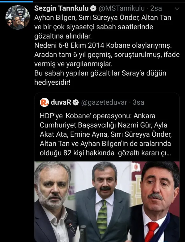 Tanrıkulu, "Ayhan Bilgen, Sırrı Süreyya Önder, Altan Tan ve birçok siyasetçi sabah saatlerinde gözaltına alındılar. Nedeni 6-8 Ekim 2014 Kobane olaylarıymış. Aradan tam 6 yıl geçmiş, soruşturulmuş, ifade vermiş ve yargılanmışlar." ifadelerini kullandı.
