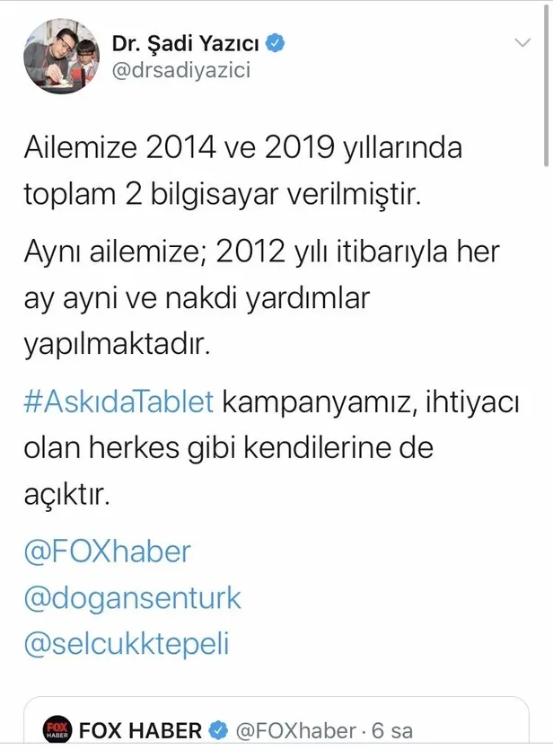 Yazıcı; FOX TV Genel Yayın Yönetmeni Doğan Şentürk ve Selçuk Tepeli'yi eleştirerek; "Ailemize 2014 ve 2019 yıllarında toplam 2 bilgisayar verilmiştir. Aynı ailemize; 2012 yılı itibarıyla her ay ayni ve nakdi yardımlar yapılmaktadır. Askıda Tablet kampanyamız, ihtiyacı olan herkes gibi kendilerine de açıktır" ifadelerini kullandı.
