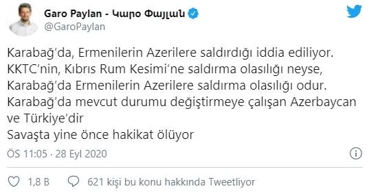 Terör örgütü PKK'nın ve Türkiye düşmanı Ermeni lobilerinin sözcülüğünü yapan HDP'li Garo Paylan, Ermenistan'ın saldırılarına sahip çıktı, Azerbaycan ve Türkiye'yi suçladı. Paylan'ın, "KKTC’nin, Kıbrıs Rum Kesimi’ne saldırma olasılığı neyse, Karabağ’da Ermenilerin Azerilere saldırma olasılığı odur. Karabağ’da mevcut durumu değiştirmeye çalışan Azerbaycan ve Türkiye’dir" sözleri büyük tepki çekti.