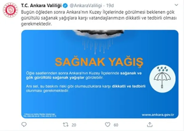 Valilik Twitter hesabında şu sözlere yer verildi; "Bugün öğleden sonra Ankara'nın Kuzey İlçelerinde görülmesi beklenen gök gürültülü sağanak yağışlara karşı vatandaşlarımızın dikkatli ve tedbirli olması gerekmektedir"