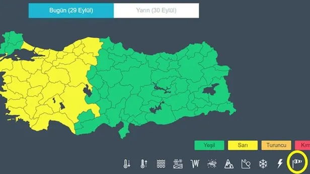 Meteoroloji'den 29 il için il için sarı kod uyarısı. Yağışların; öğleden sonra ve akşam saatlerinde yerel olarak kuvvetli olması bekleniyor. Yapılan son değerlendirmelere göre, yurdun kuzey, iç ve batı kesimlerinin parçalı yer yer çok bulutlu, Marmara'nın kuzey ve doğusu, İç Ege, Göller Yöresi, İç Anadolu'nun kuzeybatısı, Batı Karadeniz ile Çorum, Yozgat ve Kırşehir çevrelerinin sağanak ve gök gürültülü sağanak yağışlı, diğer yerlerin az bulutlu ve açık geçeceği tahmin ediliyor.