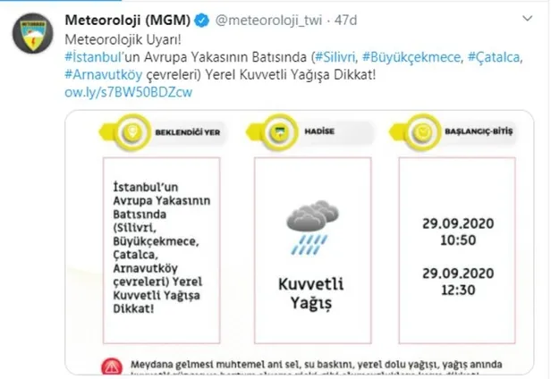 Vatandaşların ani sel, su baskını, yıldırım, dolu yağışı ve yağış anında kuvvetli rüzgar ve hortum oluşma riski gibi olumsuzluklara karşı dikkatli ve tedbirli olunmalıdır ifadelerine yer verildi.