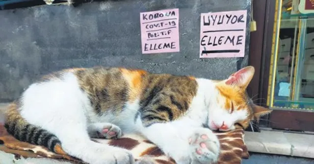 Bursa'da Şehmus Sarıkaya, kedisi Paşa’nın caddeden geçenler tarafından sevilmesinden sıkıldı! Kedinin yattığı yere ‘COVİD-19 pozitif, elleme’ yazısı astı. Artık kimsenin kediye yaklaşmadığını söyleyen Sarıkaya, “Yerinde çok rahat. Hiç kimse ellemiyor” dedi.