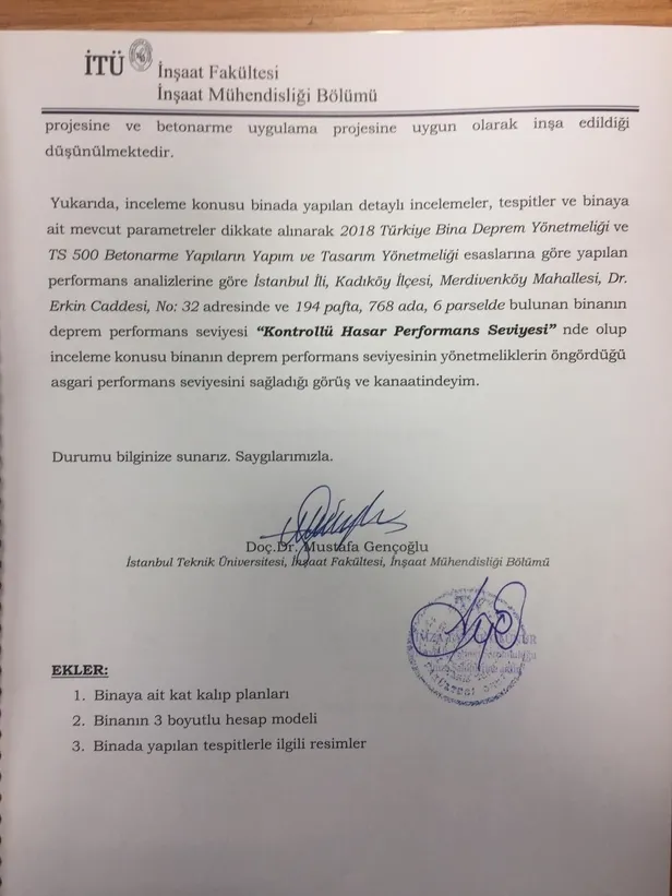 İstanbul Teknik Üniversitesi İnşaat Mühendisliği Bölümü öğretim üyesi Doç. Dr. Mustafa Gençoğlu tarafından hazırlanan raporda; İstanbul ili Kadıköy ilçesi Merdivenköy Mahallesi Dr. Erkin Caddesi No:32 adresinde ve 194 pafta, 768 ada, 6 parselde bulunan binanın deprem performans seviyesinin yönetmeliklerin öngördüğü asgari performans seviyesini sağladığı ifade edildi.
