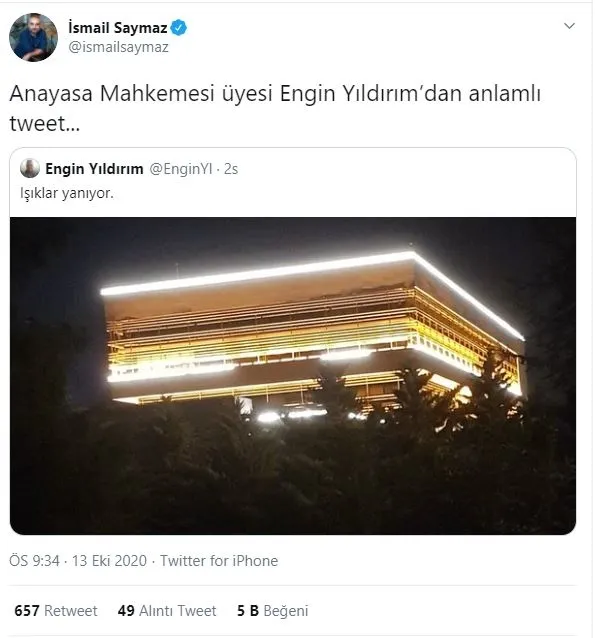 CHP yandaşı haberleriyle bilinen gazeteci İsmail Saymaz, sosyal medya hesabı Twitter'dan Anayasa Mahkemesi üyesi Engin Yıldırım'ın "ışıklar yanıyor" ifadeleriyle paylaştığı tweet ile ilgili skandal bir paylaşımda bulundu. Saymaz, "Anayasa Mahkemesi üyesi Engin Yıldırım'dan anlamlı paylaşım" diyerek skandala alenen destek verdi.