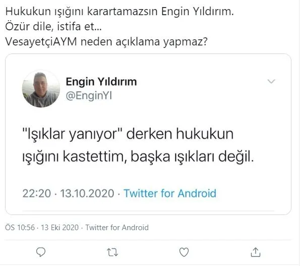 Bir başka sosyal medya kullanıcısı da, "Hukukun ışığını karartamazsın Engin Yıldırım. Özür dile, istifa et. Vesayetçi AYM neden tepki göstermez" ifadelerini kullandı.