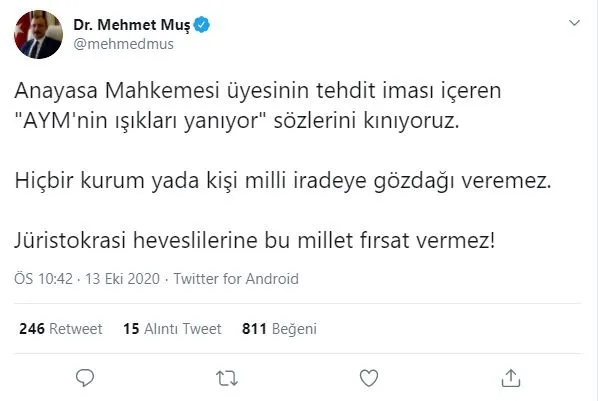 AK Parti Grup Başkanvekili İstanbul Milletvekili Mehmet Muş,"Anayasa Mahkemesi üyesinin tehdit iması içeren "AYM'nin ışıkları yanıyor" sözlerini kınıyoruz. Hiçbir kurum yada kişi milli iradeye gözdağı veremez. Jüristokrasi heveslilerine bu millet fırsat vermez!" ifadelerini kullanarak AYM üyesi Engin Yıldırım'ı kınadı.