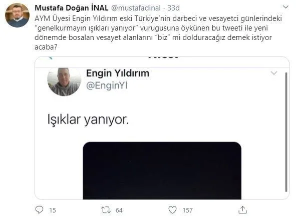 Avukat Mustafa Doğan İnal, AYM üyesi Engin Yıldırım'ın skandal paylaşımına "AYM Üyesi Engin Yıldırım eski Türkiye'nin darbeci ve vesayetci günlerindeki "genelkurmayın ışıkları yanıyor" vurgusuna öykünen bu tweeti ile yeni dönemde boşalan vesayet alanlarını "biz" mi dolduracağız demek istiyor acaba?" ifadelerini kullanarak tepki gösterdi.