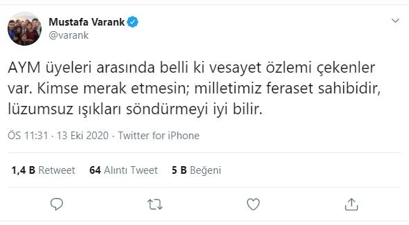 Sanayi ve Teknoloji Bakanı Mustafa Varank, "AYM üyeleri arasında belli ki vesayet özlemi çekenler var. Kimse merak etmesin; milletimiz feraset sahibidir, lüzumsuz ışıkları söndürmeyi iyi bilir" açıklamasında bulundu.