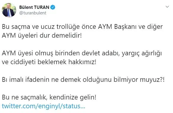 AK Parti Grup Başkanvekili, Çanakkale Milletvekili Bülent Turan, söz konusu paylaşımla ilgili, "Bu saçma ve ucuz trollüğe önce AYM Başkanı ve diğer AYM üyeleri dur demelidir! AYM üyesi olmuş birinden devlet adabı, yargıç ağırlığı ve ciddiyeti beklemek hakkımız! Bu imalı ifadenin ne demek olduğunu bilmiyor muyuz?! Bu ne saçmalık, kendinize gelin!" ifadelerini kullandı.
