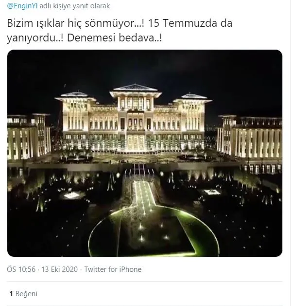 AYM üyesi Engin Yıldırım'ın skandal paylaşımına tüm Türkiye tepki gösterdi. Cumhurbaşkanlığı Külliyesi'nin ışıklarının daima açık olduğunu hatırlatan bir vatandaş, "Bizim ışıklar hiç sönmüyor. 15 Temmuz'da da yanıyordu. Denemesi bedava!" paylaşımında bulundu.