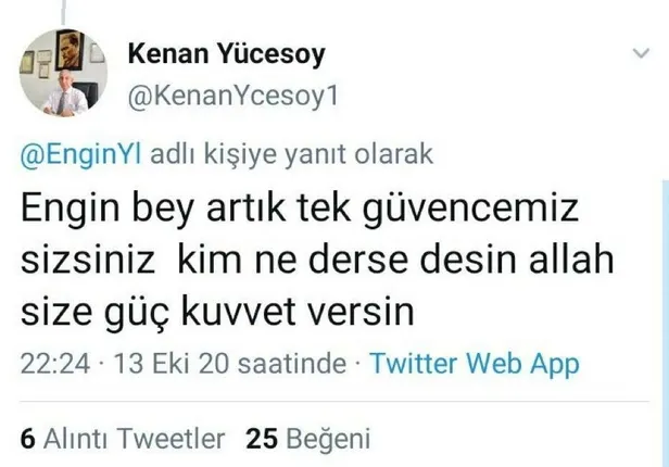 CHP'li Kenan Yücesoy'dan darbe imasında bulunan AYM üyesine destek gecikmedi! Yücesoy, "Engin Bey, artık tek güvencemiz sizsiniz. Kim ne derse desin, Allah size güç kuvvet versin" ifadelerini kullanarak AYM üyesi Engin Yıldırım'a arka çıktı.
