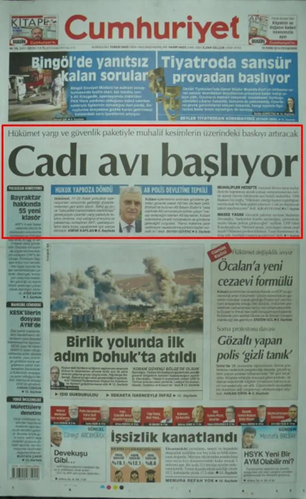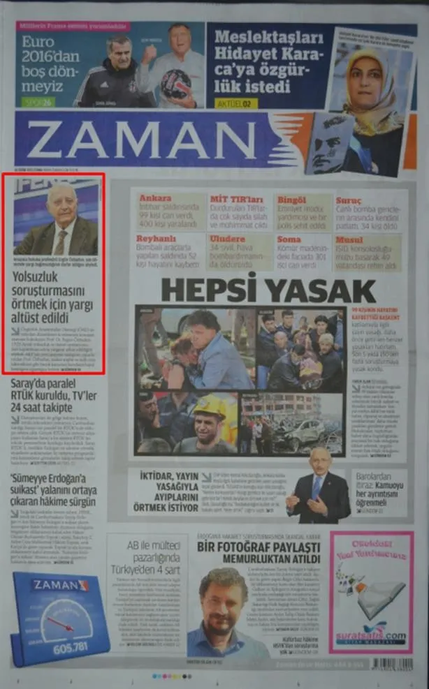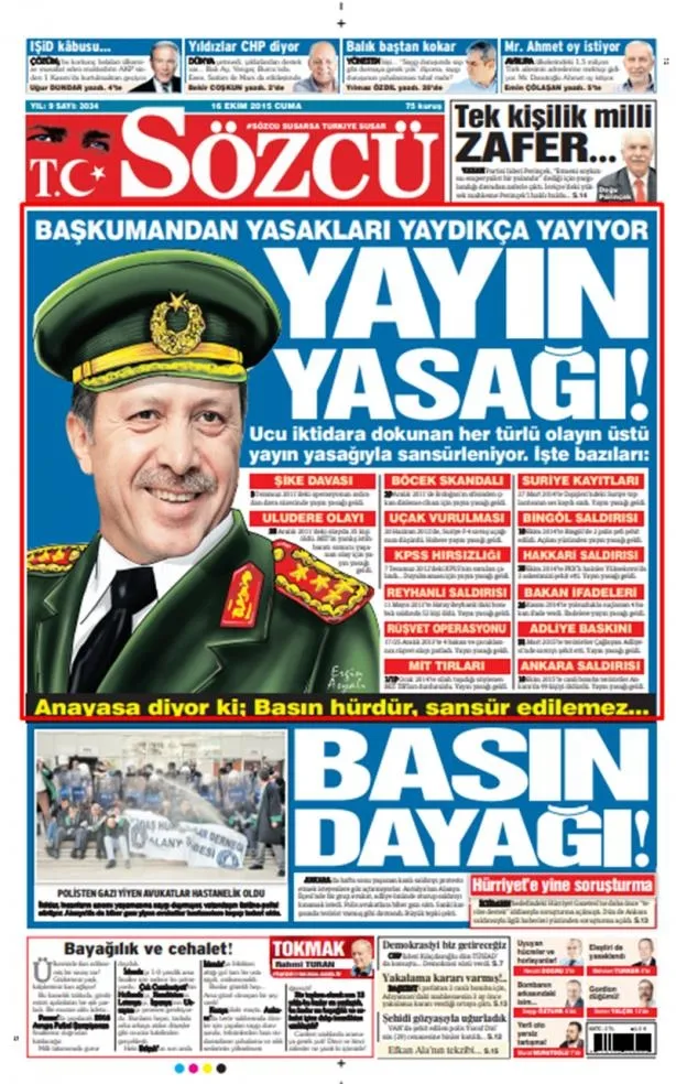 SÖZCÜ, 16 Ekim 2015: "YAYIN YASAĞI" Dersiniz ki, bu ulusalcılar hiçbir şey yazamıyorlar. Yıllardır ağlıyorsunuz, "yazamıyoruz" diye.. Devlete iftira bile attınız, "IŞİD'e silah veriyor" dediniz, ama yalan çıktı, utanmadınız.. Bu kadar yalancısınız, bu kadar müfterisiniz.. listelediğiniz her olayın arkasında, ya PKTK var, ya FETÖ. Bakın şu listeye.. Ya PKK'nın "Ben ne kadar güçlüyüm" demek için istismar edeceği cinayetler, ya da FETÖ'nün kumpasları. Bugün de söylesenize, şu olay var, yazamıyoruz, yayın yasağı var" diye. Bir tane gösterin, bir tane.. Gösteremizsiniz. çünkü PKK da bitirilme noktasına geldi, FETÖ de. Eylem yapamıyorlar ki, propaganda da yapabilsinler. Eylem yapamayınca, "birin bin gösterileceği" propaganda malzemesi olmayınca, hali ile yayın yasağı da konulmuyor!