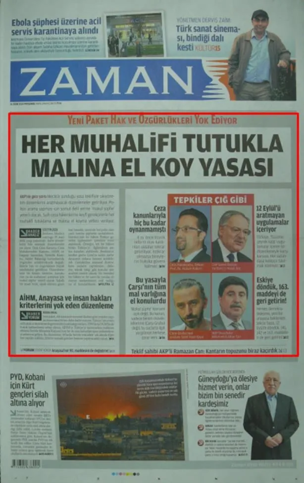 ZAMAN, 16 Ekim 2014: "HER MUHALİFİ TUTUKLA MALINA EL KOYMASI" Bu başlığın atılmasının üzerinden 6 koca yıl geçti… Şimdi bu çok bilmişler takımı, "Adamlar bizi parmağında oynatmış, sırf muhaliflik olsun diye destek verdik, adamlar bizden yüz bulup 251 kişiyi öldürdü" diyebiliyor mu? Yoksa ortalığa dökülüp, bir de utanmadan "FETÖ'yle en çok biz mücadele ettik" mi diyorlar?