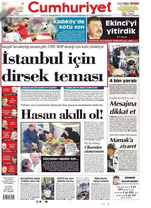 CUMHURİYET, 16 Ekim 2013: "İSTANBUL İÇİN DİRSEK TEMASI" Henüz 17-25 Aralık olmamış, dersane tartışmaları sürerken, FETÖ atacağı adımları iyi bildiği için, Mustafa Sarıgül'ü İstanbul'da büyükşehir belediye başkanlığına hazırlıyor.. O tarihlerde, "Gülen grubu da Sarıgül'ü destekleyecek" denilir iken, onlar ise kendi aralarında kıs kıs gülüp, "Yok canım, bizde bu işler hiç konuşulmaz, biz eğitim işleri ile ilgiliyiz. Seçime bir hafta kala, belki istişare ederiz" diyorlardı.. Sonra gördük ki, adamlar 17-25 Aralık'ı da, sonrasındaki süreci de, milim milim hesaplamışlar. Sizi gidi takıyyeciler sizi..