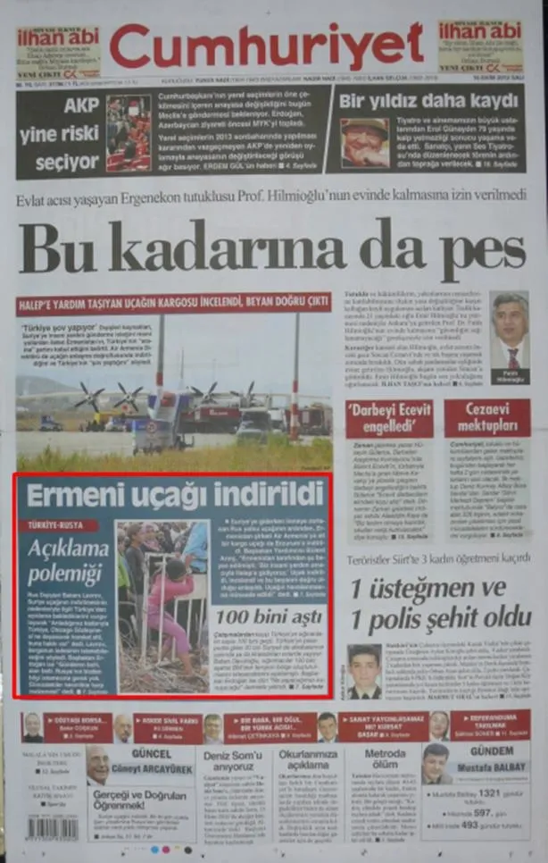 CUMHURİYET, 16 Ekim 2012: "ERMENİ UÇAĞI İNDİRİLDİ" Bu başlığı atan bir gazeteye yerli denilir mi? Türkiye Cumhuriyeti, uluslararası hukuktan aldığı yetki ile, bir uçağı incelemek üzere havaalanına indirmiş.. Kemalist Cumhuriyet, "Bu ermenilerin kendileri yardıma muhtaç bir dede, nerde kalmış gayrıya himmet ede" demeleri gerekirken.. Türkiye'nin hareketini "şov" olarak nitelendiriyorlar.. Ama aynı Cumhuriyet, kendi ülkemizin istihbarat örgütünün kontrolündeki Tırları, FETÖ'cü örgüt üyelerinin, emniyet ve savcılıklara sızarak yaptığı aramayı ise, göklere çıkarıp, ordaki bilgileri çarpıtarak, manşet yapıyorlar.. Bu gazete, bu ülkenin menfaatlerini böyle mi gözetiyor? Ermeni uçağı indirilince şov, MİT Tırları durdurulunca, "silahlara suçüstü".. Bu riyakarlık değil de nedir? Aynı gazetedeki diğer haberde, 28 Şubat döneminde Zaman'ın imtiyaz sahibi olan Alaeddin Kaya'nın darbeleri araştırma komisyonuna verdiği ifadede, "Biz teslim olmaya hazırdık, okulları verip kurtulacaktık" dediği aktarılıyor… Aynı ekip, "Şu dershaneleri okullara çevirseniz de, millet iki yere para vermese" dendi diye bayrak açıp, işi darbe teşebbüsüne kadar vardırdı… "Biz mücadele ettik" diyen ekip, teslim olmaya hazır bir örgütü niye bitirememiş, var mı bir izahı?