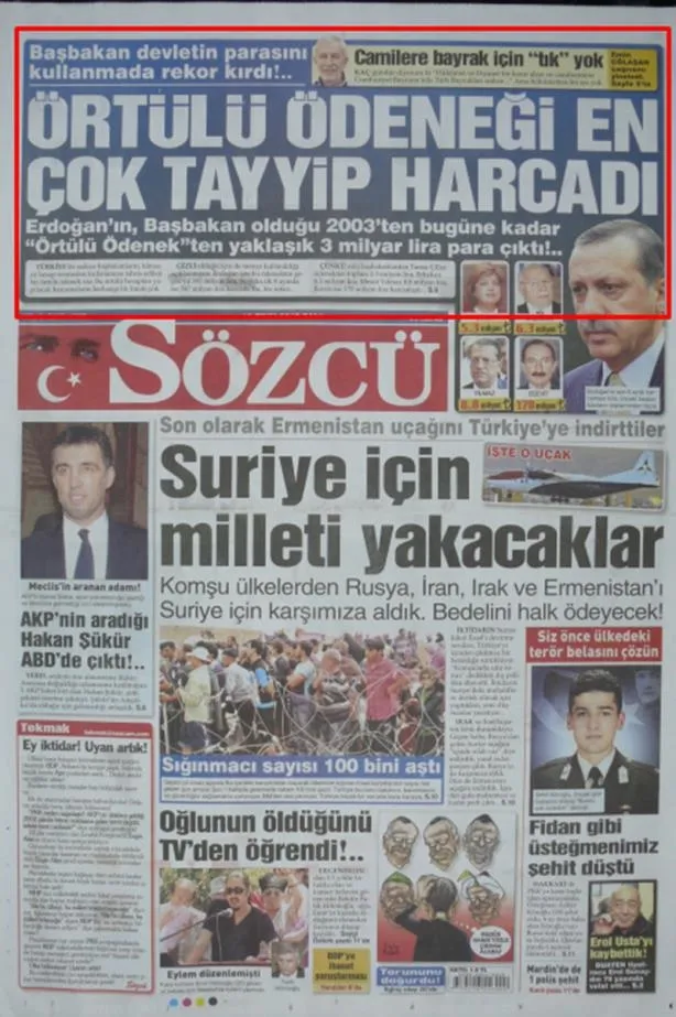 SÖZCÜ, 16 Ekim 2012: "ÖRTÜLÜ ÖDENEĞİ EN ÇOK TAYYİP HARCADI" Ya başbakanlıkları üç ay sürmüş, ya bitik ekonomi almışlar, 70 sente muhtaç bir ülkenin başbakanı olmuşlar. Ya da, dış ülkelere kapalı bir politika içinde, koalisyon hükümetinde başbakanlık yapmışlar.. Bu isimlerle, 10 yıldır başbakanlık yapmakta olan Erdoğan'ı kıyaslıyor adamlar… Üstelik, Tansu Çiller gibi örtülü ödenekteki parayı, dolandırıcı Parsadan'a Atatürk fotoğrafı için kaptırmamış, Mesut Yılmaz gibi "Nereye gittiğinden haberim yok" dememiş… Bir başka nokta, verilen rakamlar da tutarsız, ya bu rakamlar ya da mesela geçen sene (2019) yine Sözcü'nün yazarı olan Çiğdem Toker'in ayrıntılı verdiği rakamlar yalan! Kimbilir, belki de ikisi de yalandır. Bunlardan her şey beklenir..