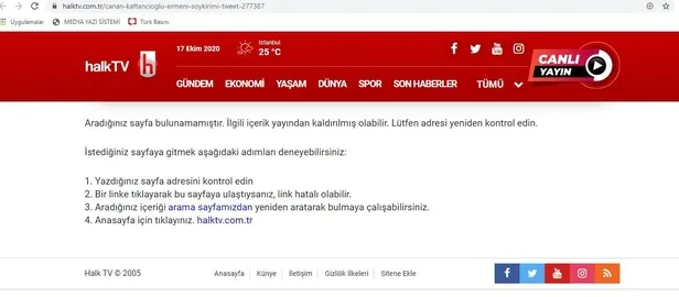 Halk TV'nin; "Canan Kaftancıoğlu'ndan Ermeni Soykırımı iddialarını kabul eden tweet!" başlıklı tweetindeki linke tıklandığında haberin silindiği açıkça görülüyor.
