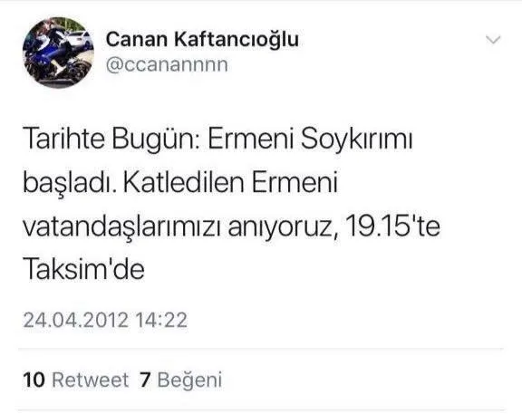 Canan Kaftancıoğlu; 24 Nisan 2012 tarihinde sosyal paylaşım sitesi Twitter'daki şahsi hesabından paylaşımda bulundu ve Türkiye'yi hedef alarak, "Tarihte bugün: Ermeni Soykırımı başladı. Katledilen Ermeni vatandaşlarımızı anıyoruz. 19.15'te" ifadelerini kullandı.
