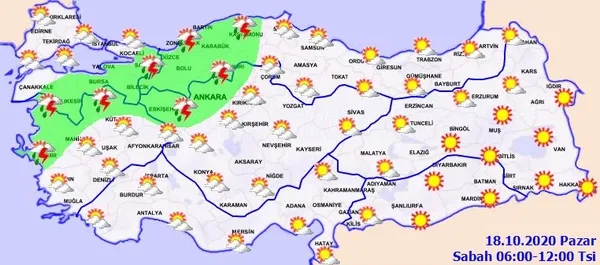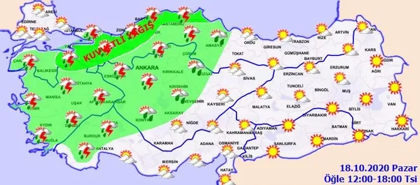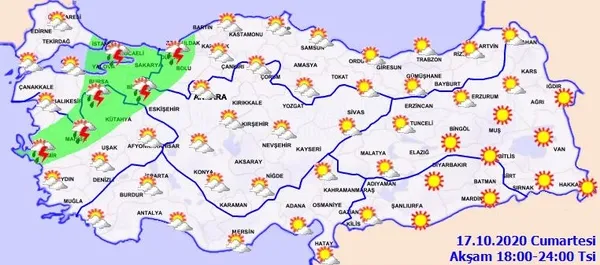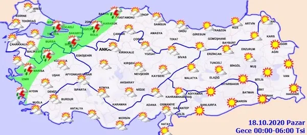 Meteoroloji Genel Müdürlüğü tarafından yapılan son açıklamaya göre; Ülkemizin kuzey, iç ve batı kesimlerinin parçalı ve yer yer çok bulutlu, Marmara'nın güney ve doğusu, Ege, Batı Akdeniz'in iç kesimleri, İç Anadolu'nun kuzeybatısı, Batı Karadeniz ile Konya, Aksaray, Nevşehir, Yozgat, Samsun, Amasya ve Çorum çevrelerinin sağanak ve gök gürültülü sağanak yağışlı, diğer yerlerin az bulutlu ve açık geçeceği tahmin ediliyor. Yağışların Sakarya, Bursa, Bilecik, Yalova, Bolu, Zonguldak, Bartın, Kastamonu kıyıları ile Sinop çevrelerinde yer yer kuvvetli olması bekleniyor." denildi. İşte 18 Ekim hava durumu.