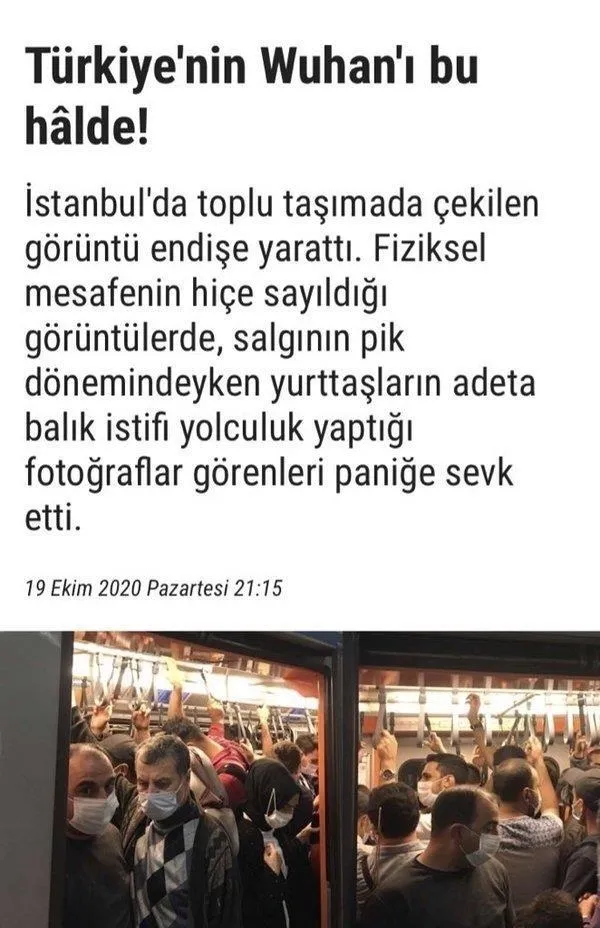 Haberde; "İstanbul'daki toplu taşıma görüntüleri endişe yarattı. Metroda çekilen bir fotoğraf, Türkiye'nin Wuhan'ı olarak adlandırılan İstanbul'da fiziksel mesafenin hiçe sayıldığını gözler önüne seriyor" ifadeleri yer aldı.