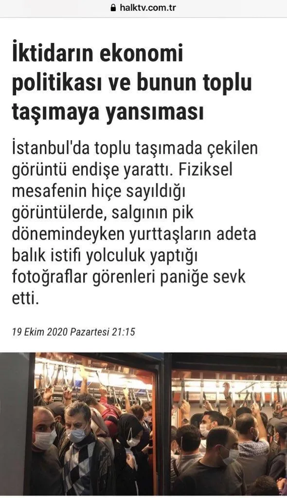 Halk TV; saat:21.15'te yayınladığı haberde toplu taşımada yaşanan yoğunluğun İstanbul Büyükşehir Belediyesi'nin iştiraki İstanbul Elektrik Tramvay Tünel İşletmesi (İETT) bağlı metrolarda yaşandığını açıkladı ve metroda yoğunluğu gösteren fotoğraf yayınlandı. Aynı Halk TV; saat 23.39 yayınladığı haberde ise, toplu taşımadaki yoğunluğu iktidara bağladı!