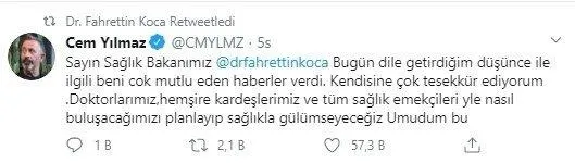 Cem Yılmaz, "Sayın Sağlık Bakanımız Fahrettin Koca, bugün dile getirdiğim düşünce ile ilgili beni çok mutlu eden haberler verdi. Kendisine çok teşekkür ediyorum." ifadelerine yer verdi.