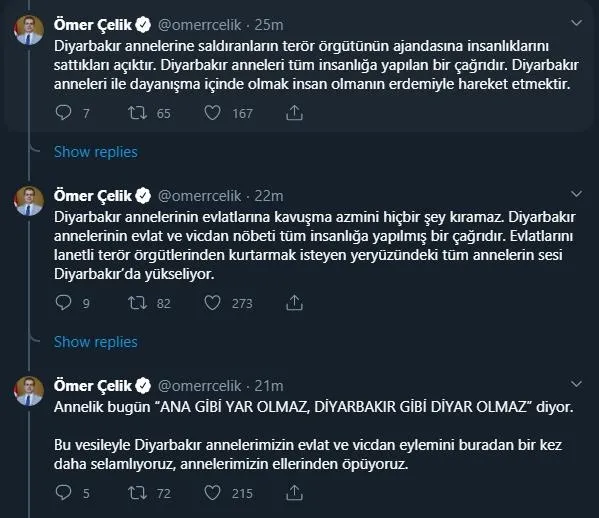 Evlatlarını lanetli terör örgütlerinden kurtarmak isteyen yeryüzündeki tüm annelerin sesi Diyarbakır'da yükseliyor. Annelik bugün 'Ana gibi yar olmaz, Diyarbakır gibi diyar olmaz' diyor. Bu vesileyle Diyarbakır annelerimizin evlat ve vicdan eylemini buradan bir kez daha selamlıyoruz, annelerimizin ellerinden öpüyoruz."
