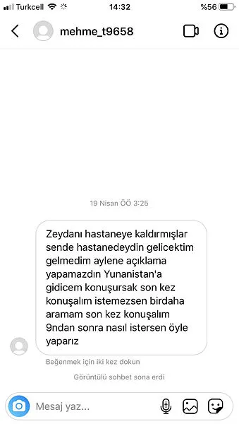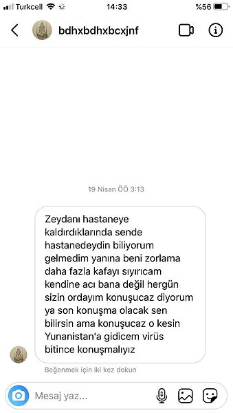 "Zeydan'ı hastaneye kaldırdıklarında sen hastanedeydin biliyorum yanına gelmedim. Beni zorlama daha fazla. Kafayı sıyıracağım, kendine acı bana değil. Hergün sizin oradayım, konuşacağız diyorum ya son konuşma olacak sen bilirsin ama konuşacağız o kesin. Yunanistan'a gideceğim virüs bitince konuşmalıyız."