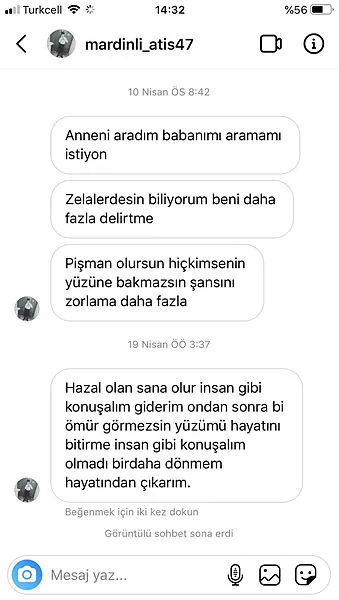 "Anneni aradım babanı mı aramamı istiyorsun? Zelallerdesin biliyorum ama beni daha fazla delirtme. Pişman olursun hiç kimsenin yüzüne bakamazsın şansını zorlama daha fazla."