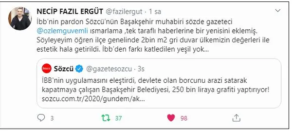 Başakşehir Belediyesi Basın Danışmanı Necip Fazıl Ergut; sosyal paylaşım sitesi Twitter'daki şahsi hesabından açıklamada bulundu ve "İstanbul Büyükşehir Belediyesi'nin pardon Sözcü'nün muhabiri sözde gazeteci Özlem Güvemli ısmarlama, tek taraflı haberlerine bir yenisini eklemiş. Söyleyeyim öğren ilçe genelinde 2 bin m2 gri duvar ülkemizin değerleri ile estetik hala getirildi. İbb'den farkı katledilen yeşil yok..." ifadelerini kullandı.
