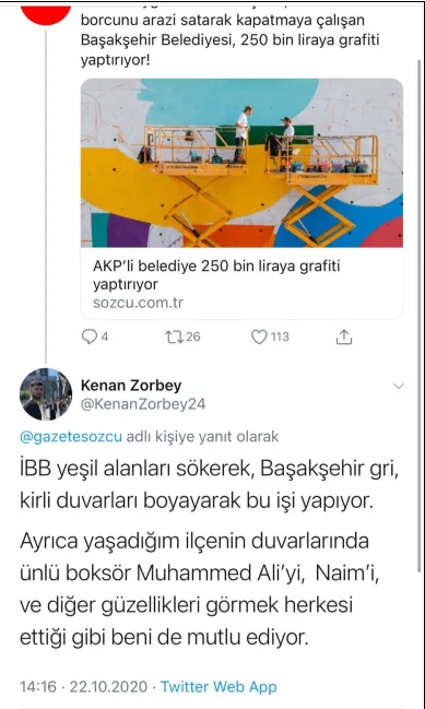 Başakşehir Belediyesi Basın Danışmanı Necip Fazıl Ergut, ilçe genelinde 2 bin m2 gri duvarın ülkemizin değerleriyle estetik hale getirildiğini belirterek, "İBB'den farkı katledilen yeşil yok..." dedi.