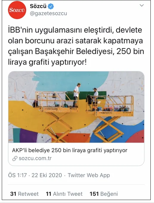 Sözcü Gazetesi; CHP'li İstanbul Büyükşehir Belediyesi'nin yeşil düşmanlığını gözler önüne serdiği dikey bahçe katliamını görmezden geldi. İBB yönetiminin duvarlara yapılan anlamsız grafiti çizimlerine sahip çıkan Sözcü Gazetesi, Başakşehir Belediyesi'nin duvarlarına çizilen şehitlerin ve Türkiye tarihine damgasını vuran spor, sanatçı ve düşünürleri hazmedemedi.