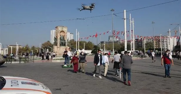 Taksim Meydanı'nda polis drone destekli maske denetimi yaptı. Maskesini çenesine indirenler ve maske takmayan kişiler tek tek uyarıldı. Polis kişilerin yoluna maskesiz devam etmesine izin vermedi.