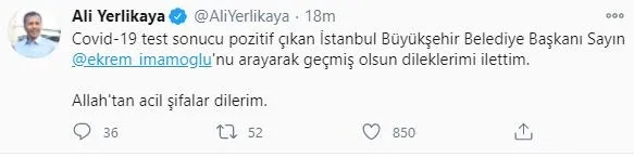 İstanbul Valisi Ali Yerlikaya da Twitter hesabından, "Kovid-19 test sonucu pozitif çıkan İstanbul Büyükşehir Belediye Başkanı Sayın Ekrem İmamoğlu'nu arayarak geçmiş olsun dileklerimi ilettim. Allah'tan acil şifalar dilerim." paylaşımında bulundu.