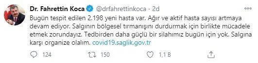 Sağlık Bakanı Fahrettin Koca "Bugün tespit edilen 2.198 yeni hasta var. Ağır ve aktif hasta sayısı artmaya devam ediyor. Salgının bölgesel tırmanışını durdurmak için birlikte mücadele etmek zorundayız. Tedbirden daha güçlü bir silahımız bugün için yok. Salgına karşı organize olalım." ifadelerini kullandı.